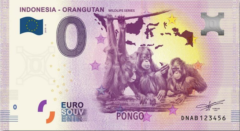 Zaujímavá bankovka s orangutanom a nulovou hodnotou 0 €.